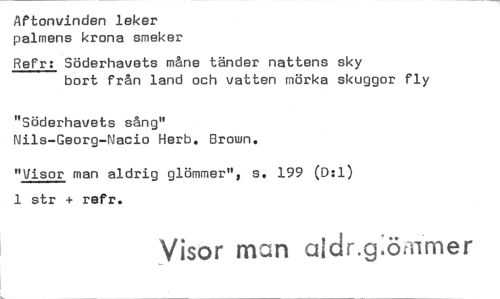 //// Aftonvinden leker palmens krona smeker //// Refr: Söderhavets måne tänder nattens sky bort från land och vatten mörka skuggor fly //// "Söderhavets sång" //// Nils-Georg-Nacio Herb. Brown. //// "Visor man aldrig glömmer", s. 199 (D:1) 1 str + refr. //// Visor man aidr.g:örnmer ////