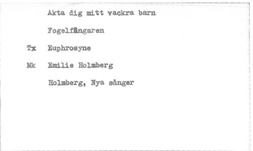 //// Akta dig mitt vackra barn //// Fogelfångaren //// Tx. Euphrosyne //// Dyk Emilie Holmberg //// Holmberg, Nya sånger ////