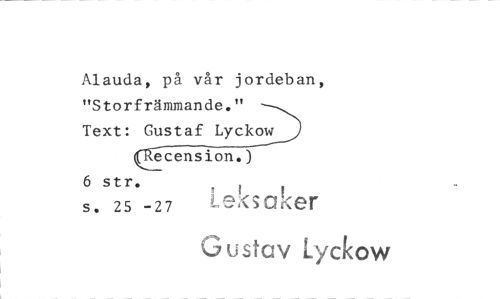 //// Alauda, på vår jordeban, "Storfrämmande." Text: Gustaf Lyckow //// ecension.) //// 6 str. //// s. 25 27 Leksaker //// Gustav lyckow ////