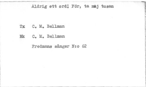 //// Aldrig ett ord: För, ta nöj tusan //// Tx C. M. Bellman Mk C. M. Bellman //// Fredmans sånger N:o 62 ////