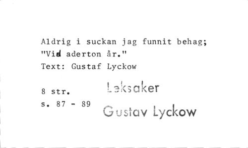 //// Aldrig i suckan jag funnit behag; "Vid aderton år." Text: Gustaf Lyckow //// 8 str. ki a ker //// s. 87 - 89 r.: gavLyckow ////