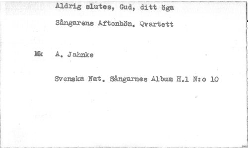 //// Aldrig slutes, Gud, ditt öga Sångarens Aftonbön. Qvartett //// Mk A. Jahnke //// Svenska Nat. Sångarnas Album H.1 N:o 10 ////