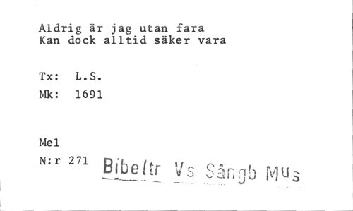 //// Aldrig är jag utan fara Kan dock alltid säker vara //// Tx: L.S. Mk: 1691 //// Mel //// N:r 271 Bibeltr Vs Sår-i-ib Mus ////