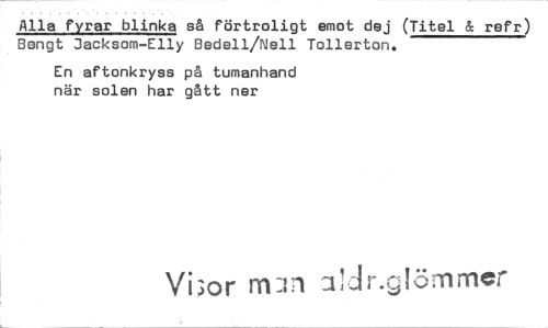 //// Alla fyrar blinka så förtroligt emot dej (Titel & refr) Bengt Jacksom-Elly Bedell/Nell Tollerton. //// En aftonkryss på tumanhand när solen har gått ner //// Visor mil 1 ömmar ////