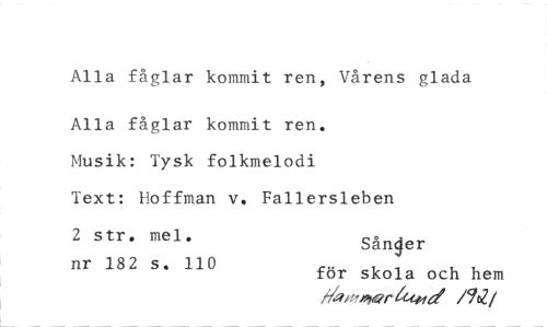 //// Alla fåglar kommit ren, Vårens glada //// Alla fåglar kommit ren. Musik: Tysk folkmelodi //// Text: Hoffman v. Fallersleben //// 2 str. mel. Sånger //// nr 182 s. 110 för skola och hem //// Ibm"er‘utiel /92 //// /