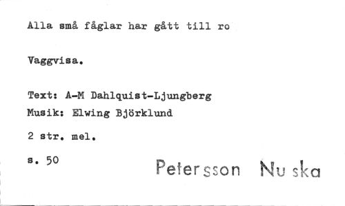//// Alla små fåglar har gått till ro Vaggvisa. //// Text: A-M Dahlquist-Ljungberg Musik: Elwing Björklund //// 2 str, mel. //// s. 50 Peter don Nu - ////