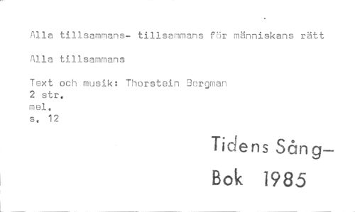 //// Alla tillsammans- tillsammans för människans rätt Alla tillsammans //// Text och musik: Thorstein Bergman //// 2 str. mel. //// s. 12 //// Tidens Sång— //// Bok 1985 ////