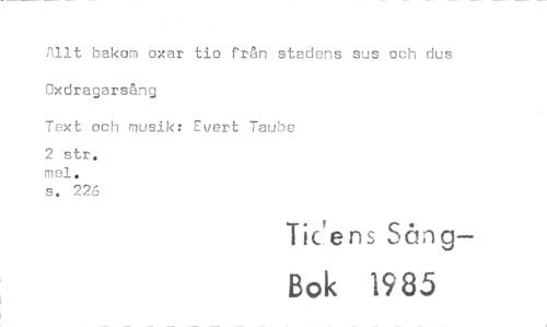 //// Allt bakom oxar tio från stadens sus och dus Oxdragarsång //// Text och musik: Evert Taube //// 2 str. mel. //// s. 226 //// Tic'ens Sång— //// Bok 1985 ////