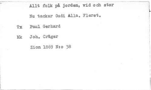 //// Allt folk på jorden, vid och stor //// Nu tackar Gudi Alla. Floret. //// Tx Paul Gerhard //// Mk Joh. CrUger //// Zion 1869 Nto 38 ////