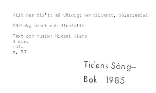 //// Allt har bli'tt så väldigt komplicerat, polariserat Kärlek, ömhet och disciplin //// Text och musik: Mikael Wiehe //// 4 str. mel. //// s. 90 //// Tic ens Sång- //// Eok 1985 ////