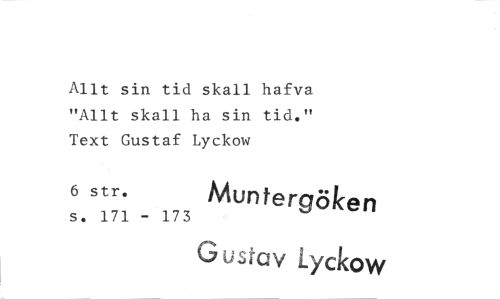 //// Allt sin tid skall hafva "Allt skall ha sin tid." Text Gustaf Lyckow //// 6 str. Muntergöken //// s. 171 - 173 //// G utav Lyckow ////