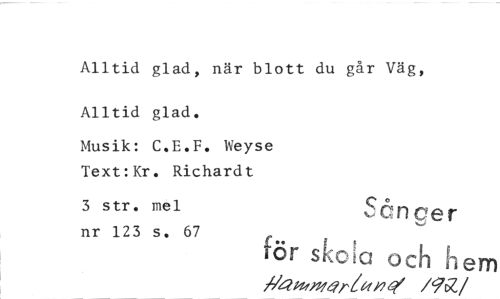 //// Alltid glad, när blott du går Väg, Alltid glad. //// Musik: C.E.F. Weyse Text:Kr. Richardt //// 3 str. mel nr 123 s. 67 Sånger //// för skela och hem //// irapk~rIbti/4" /9cZ //// /