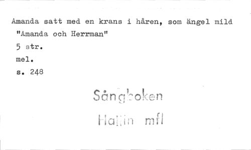 //// Amanda satt med en krans i håren, som ängel mild //// "Amanda och Herrman" //// 5 str. //// mel. //// s. 248 //// Sånelp.7oken //// rnfi ////