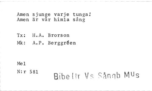 //// Amen sjunge varje tunga! Amen är vår himla sång //// Tx: H.A. Brorson Mk: A.P. Berggr6en //// Mel //// N:r 581 Bibe r \is Sånnb Mus ////