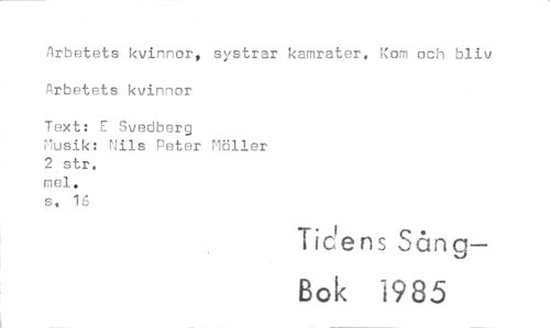 //// Arbetets kvinnor, systrar kamrater. Kom och bliv Arbetets kvinnor //// Text: E Svedberg //// Musik: Mils Peter Möller //// 2 str, //// mol. //// s, 16 //// Tidens Sång— //// Bok 1985 ////