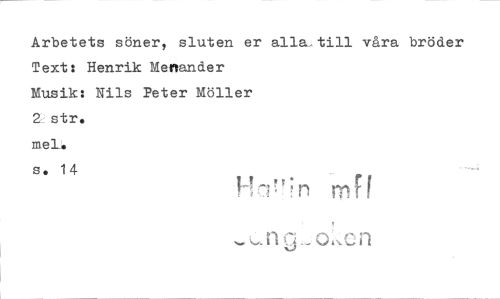 //// Arbetets söner, sluten er alla-till våra bröder Text: Henrik Menander //// Musik: Nils Peter Möller //// 2 str. //// s. 14 H mr! //// 0 On ////