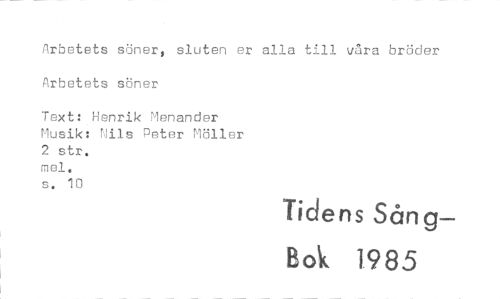 //// Arbetets söner, sluten er alla till våra bröder Arbetets söner //// Text: Henrik Menander //// Musik: Nils Peter Möller //// 2 str. //// mel. s. 10 //// Tidens Sång— //// Bok 1.985 ////