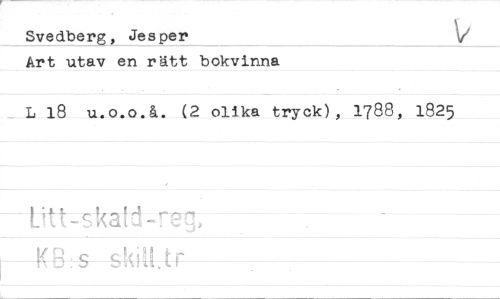 //// Svedberg, Jesper //// Art utav en rätt bokvinna //// L 18 u.o.o.å. (2 olika tryck), 1788, 1825 //// .s 8-killfr ////