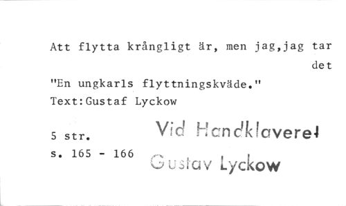 //// Att flytta krångligt är, men jag,jag tar //// det //// "En ungkarls flyttningskväde." Text:Gustaf Lyckow //// 5 str. Vid Hcncik,averei //// s. 165 - 166 Gustav Lyckow ////
