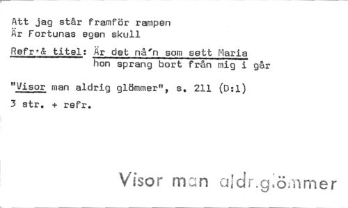 //// Att jag står framför rampen Är Fortunas egen skull //// Refr-le titel: Är det nå'n som sett Maria hon sprang bort från mig i går //// "Visor man aldrig glömmer", s. 211 (D:1) 3 str. + refr. //// Visor ni:n aIdr.g,ö:arner ////