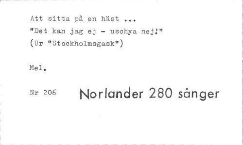 //// Att sitta på en häst ... //// "Det kan jag ej — uschya nej:" (Ur "Stockholmsgask") //// Mel. //// Nr 206 Norlander 280 sånger ////