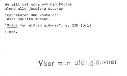 //// Av allt det goda som man förtär bland alla jordiska drycker //// "Kaffetåren den bästa är" Text: Maurits Kraner. //// "Visor man aldrig glömmer", s. 230 (D:1) 6 str. //// •• //// Visor m n al o //// g..nmer ////
