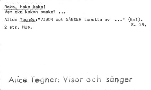 //// Bake, baka kaka! //// Vem ska kakan smaka? ... //// Alice Teqnft:"VISOR och SÅNGER tonstta av ..." (E:1). //// 2 str. Mus. S. 15. //// Aike Tegnerv Visor o sånger ////