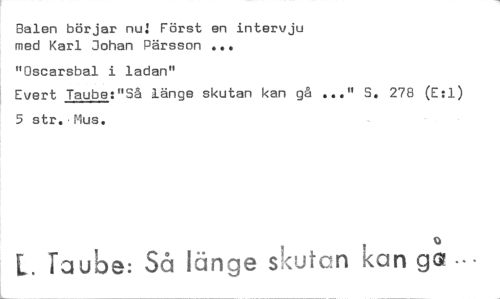 //// Balen börjar nu! Först en intervju med Karl Johan Pärsson tt S. 278 (E:1) //// "Oscarsbal i ladan" • • • //// Evert Taube:"Så länge skutan kan gå 5 str..Mus. //// 0 //// Taube: Så länge skutan kan • ////
