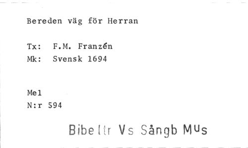 //// Bereden väg för Herran //// Tx: F.M. Franzén Mk: Svensk 1694 //// Mel //// N:r 594 //// Bibe Hr V s Sångb Mus ////