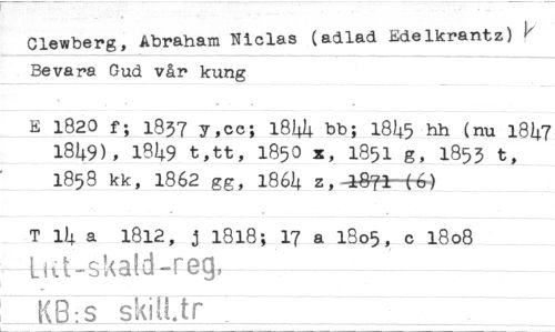 //// Clewberg, Abraham Niclas (adlad Edelkrantz) k Bevara Gud vår kung //// E 1820 f; 1837 y,cc; 1844 bb; 1845 hh (nu 1847 //// 1849), 1849 t,tt, 1850 x, 1851 g, 1853 t, //// 1858 kk, 1862 gg, 1864 z,--1-8?-1"-±6.) //// T 14 a 1812, j 1818; 17 a 13o5, c 18o8 //// tät-skald-reg, //// KB:s slaW ////