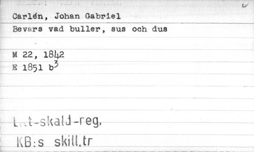 //// Carldn, Johan Gabriel //// Bevars vad buller, sus och dus M 22, 18L.2 //// 7 //// E 1851 b-) //// A.--sk;ä1J--fe-g, //// KB:s skiU.tr ////