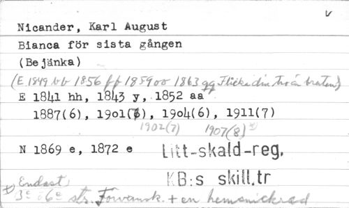//// Nicanier, Karl August Bianca för sista gången (Beyinka) //// 15419 11.5-6 tf /y Fiera- Liri_?72.44.4 //// E 1841 hh, 1843 y».1852 aa //// 1887(6), 19o1(f), 19o4(6), 1911(7) //// /5°1-(7) 000).1 //// titt-skaid-reg, //// KB:s_ //// ÷ //// //// N 1869 e, 1872 e ////