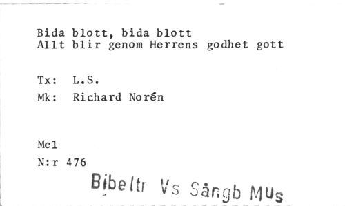 //// Bida blott, bida blott //// Allt blir genom Herrens godhet gott //// Tx: L.S. //// Mk: Richard Norén //// Mel //// N:r 476 //// Bibeltr Vs Sångb Mus ////