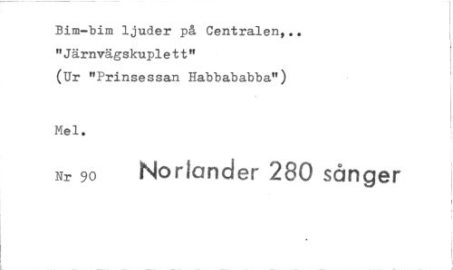 //// Bim—bim ljuder på Centralen,.. "Järnvägskuplett" //// (Ur "Prinsessan Habbababba") //// Mel. //// Nr 90 Norlander 280 sånger ////