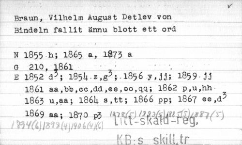 //// Braun, Vilhelm August Detlev von Bindeln fallit ännu blott ett ord //// N 1855 h; 1865 a, 14373 a //// G 210, 1861 //// • 1852 33; 1854 z,g3; 1856 y, jj; 1859 jj //// 1861 aa,bb,cc,dd,ee,00,qq; 1862 p,u,hh1863 u,aa; 1864 s,tt; 1866 pp; 1867 ee,d3 //// 1869 aa; 1873 p3 //// k.,r1# //// T //// //// ////