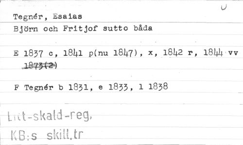 //// Tegnér, Esaias //// Björn och Fritjof sutto båda //// E 1837 c, 1841 p(nu 1847), x, 1842 r, 1844 vy -154444S //// F Tegnér b 1831, e 1833, 1 1838 //// t d-skald -reg, //// skilltr ////