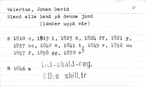 //// Valerius, Johan David //// Bland alla land på denna jord (länder uppå vår) //// E 1810 c, 1019 1, 1823 d, 1824 ff, 1821 y, //// 1837 cc, 1840 v, 1841 t, 1849 v, 1852 uu //// 1857 f, 1858 gg, 1870 v3 //// Lia-skatd-reg, //// R 1846 a //// t's13:s skitt.tr ////