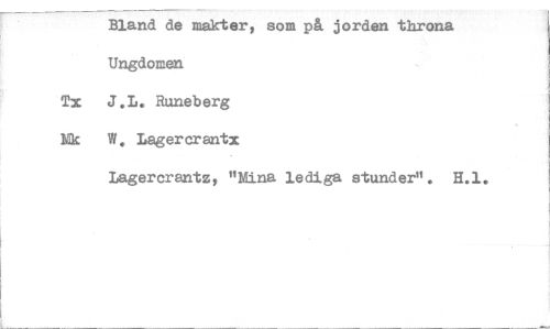 //// Bland de makter, som på jorden throna //// Ungdomen //// Tx J.L. Runeberg //// Nk W. Lagercrantx //// Lagercrantz, "Mina lediga stunder". H.1. ////