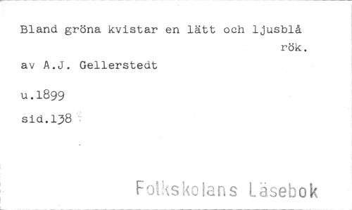 //// Bland gröna kvistar en lätt och ljusblå //// rök. //// av A.J. Gellerstedt //// u.1899 //// sid.138 //// Foksko lan s Läsebok ////