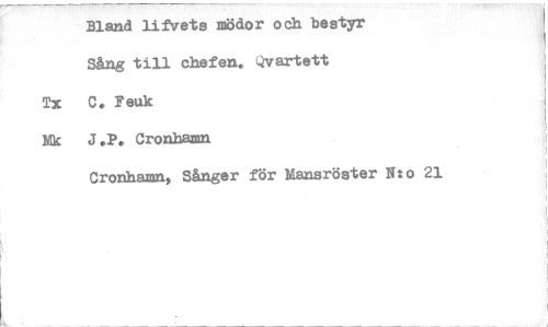 //// Bland lifVets mödor och bestyr //// Sång till chefen. Qvartett //// Tx C. Feuk //// Mk J.P. Cronhamn //// Cronhamn, Sånger för Mansröster Nto 21 ////