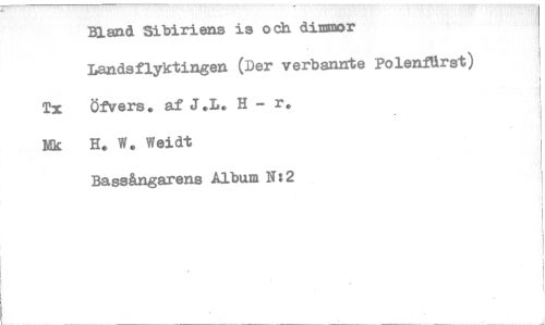 //// Bland Sibiriens is och dimmor //// Landsflyktingen (Der verbannte PolenfUrst) Tx ÖfVers. af J.L. H - r. Nk H. W. Weidt //// Bassångarens Album N:2 ////
