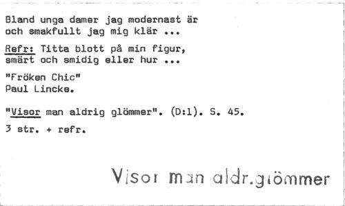 //// bland unga damer jag modernast är och smakfullt jag mig klär ... //// Ref r: Titta blott på min figur, smärt och smidig eller hur ... //// "Fröken Chic" Paul Lincke. //// "Visor man aldrig glömmer". (D:1). S. 45. 3 str. + refr. //// Visor m:m aldr.jiörnmer ////