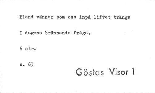 //// Bland vänner som oss inpå lifvet tränga I dagens brännande fråga. //// 6 str. s. 63 //// Gös k3 Vi ////