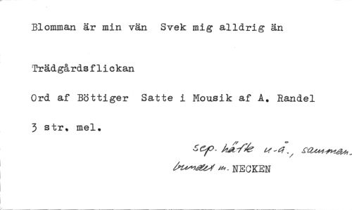//// Blomman är min vän Svek mig alldrig än //// Trädgårdsflickan //// Ord af Böttiger Satte i Mousik af A. Randel 3 str, mel. //// 6ef Auilk //// 61.4~ - NECKEN ////
