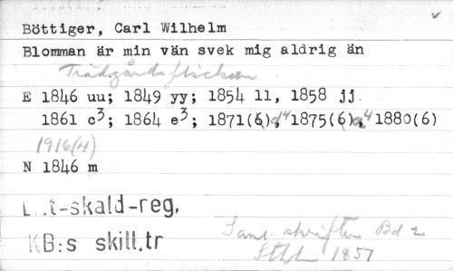 //// v //// Böttiger, Carl Wilhelm //// Blomman är min vän svek mig aldrig än //// E 18)46 uu; 18/49 YY ; 185)4 11, 1858 jj //// 1861 c5; 1864 e5; 1871(6), 1875(6), 1889(6) //// i')/(0911 N 1846 m //// Å-skald-Feg, //// [3:5- skiU.tr ////