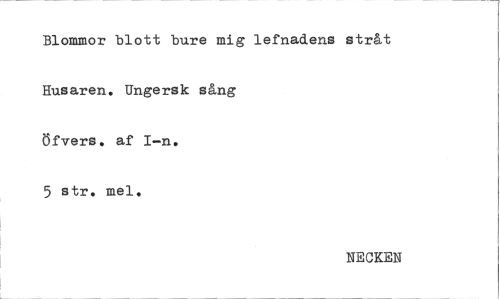 //// Blommor blott bure mig lefnadens stråt Husaren. Ungersk sång //// Öfvers. af I—n. //// 5 str, mel. //// NECKEN ////