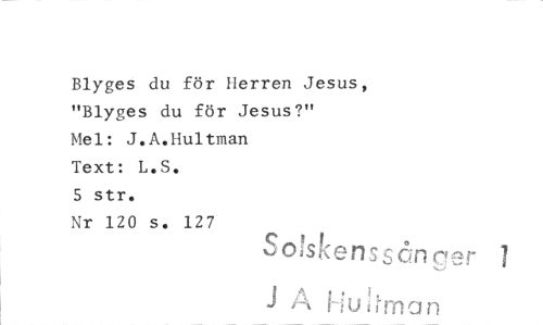 //// Blyges du för Herren Jesus, //// "Blyges du för Jesus?" //// biel: J.A.Hultman //// Text: L.S. //// 5 str. //// Nr 120 s. 127 //// So!skenssein ger 1 J A Hu ä i-t-nan ////