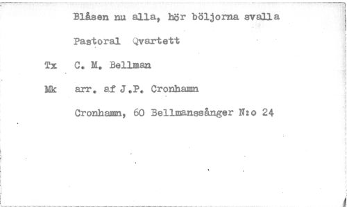 //// Blåsan nu alla, hör böljorna svalla //// Pastoral Qvartett //// Tx C. M. Bellman //// Nk arr, af J.P. Cronha:mi //// Cronhamn, 60 Bellmanssånger N:o 24 ////