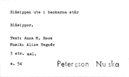 //// Blåsippan ute i backarna står Blåsippor. //// Text: Anna M. Roos Musik: Alice Tegnér //// 3 str. mel. //// ss 54 ////