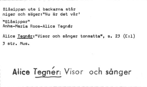 //// Blåsippan ute i backarna står niger och säger:"Nu är det vår' //// "Blåsippor" //// Anha-Maria Roos-Alice Tegnér //// Alice Tednår:"Visor och sånger tonsatta", s. 23 (E:1) 3 str. Mus. //// Alice regnen Visor och sånger ////